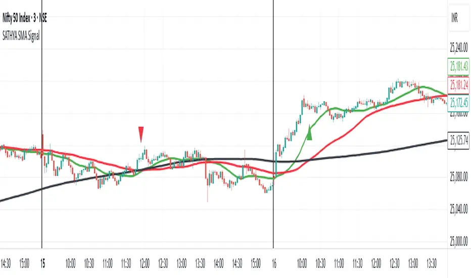 This indicator overlays 20, 50, and 200 Simple Moving Averages (SMAs) on the chart. It generates bullish signals when the 20 SMA crosses above the 200 SMA before the 50 SMA, with both above 200 SMA. Bearish signals occur when the 20 SMA crosses below the 200 SMA before the 50 SMA, with both below 200 SMA. Signals appear as distinct triangles on the chart, helping traders identify trend reversals based on systematic SMA crossovers and order of crossing.סקריפט קוד פתוח