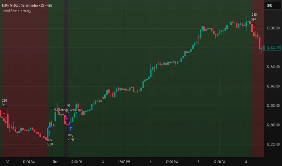 **Trend Flow X Strategy** is an advanced trend–following and momentum–driven system specifically optimized for the **Midcap Nifty Index** on the **15-minute timeframe**.