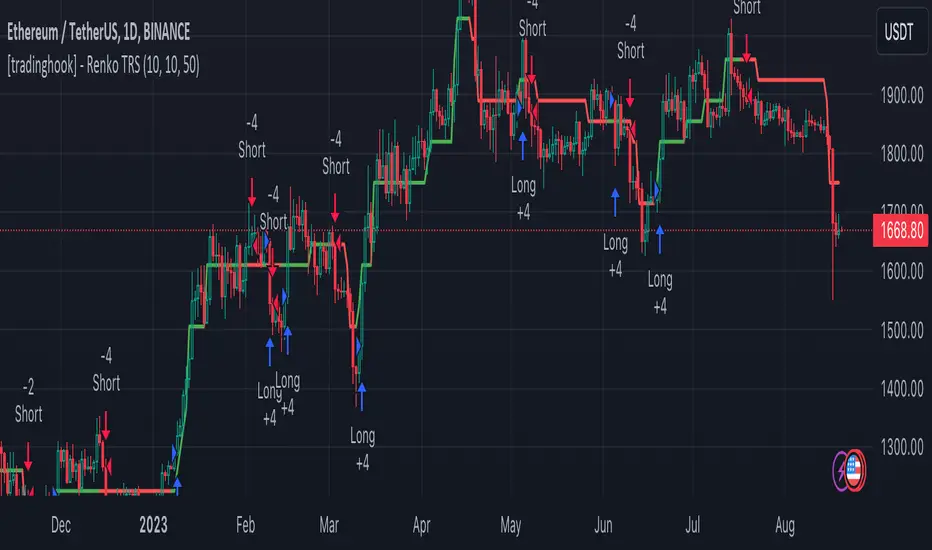 The Renko Trend Reversal Strategy ([tradinghook] - Renko TRS) is a powerful and original trading approach designed to identify trend reversals in financial markets using Renko charts. Renko charts differ from traditional time-based charts, as they focus solely on price movements and ignore time, resulting in a clearer representation of market trends. This strategy leverages Renko charts in conjunction with the Average True Range (ATR) to capture trend reversals with high precision and effectiveness.