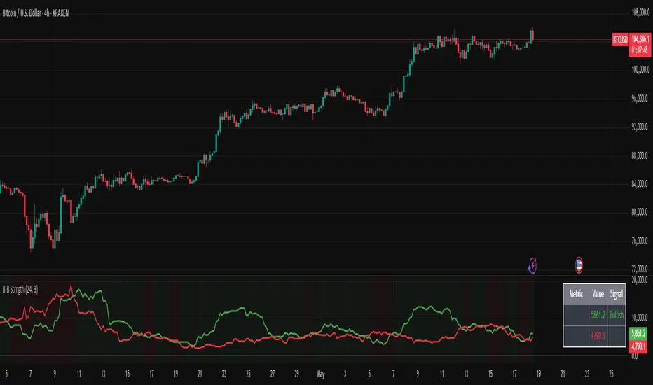 This indicator analyzes candlestick body sizes to measure bullish versus bearish strength over a specified period. Here's what it does: