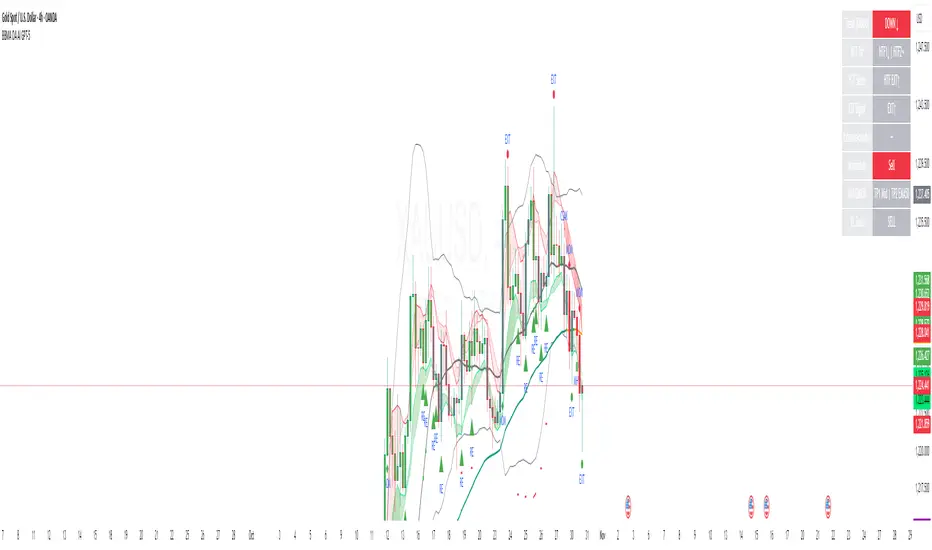 Signals (Direction Indicators)The system combines Bollinger Bands (20, 2) with EMA50, EMA200, and MA5/10 High–Low to detect the following:Extreme (EXT) – MA5/10 breaks outside the Outer BB → potential end of trend (reversal signal).