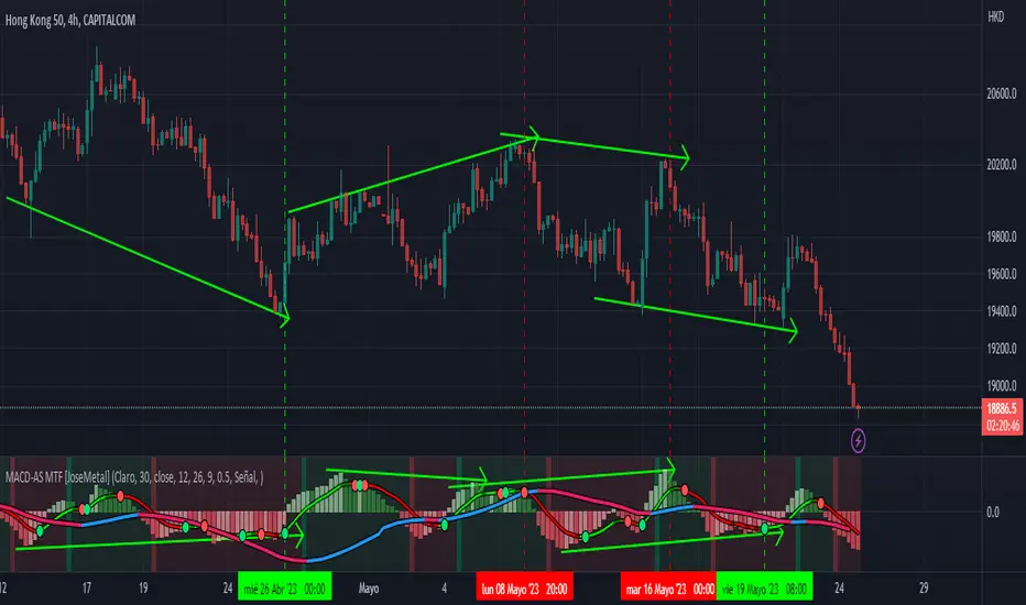 Mi uso favorito es encontrar DIVERGENCIAS con el MACD-AS (histograma) y el HTF MACD-AS, teniendo 2 confirmaciones, ej: 5m divergencia + 15m divergencia.