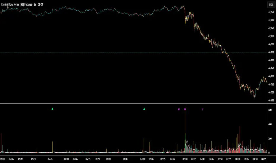 Detects statistically significant buy/sell volume spikes inside two DST-aware Mountain Time sessions and projects 1m / 5m / 10m signals onto any chart timeframe (even 1s). Spikes are confirmed at the close of their native bar and are edge-triggered with optional cooldowns to prevent duplicate alerts.