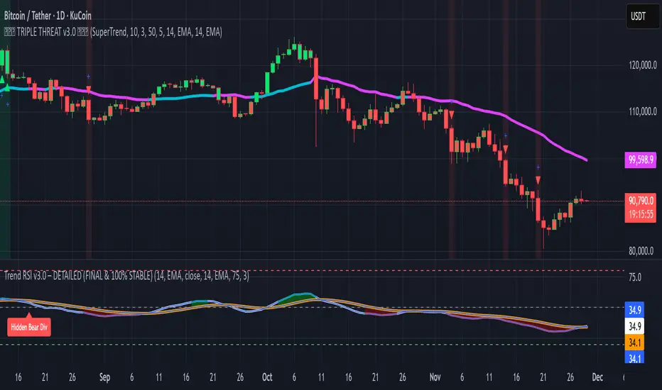 v2.0. Added certainty logic to confirm trends, several tweaks under the hood, some cosmetic changes, and even divergence detection that only shows the type that historically shows up before bigger trend changes. When lines get to the upper or lower line, a shading will start. When the shading starts you are within the TP zone. Usually sharp reversals happen at 20 or 80, but a few days after the lines to allow for a bit more early warningהערות שחרור