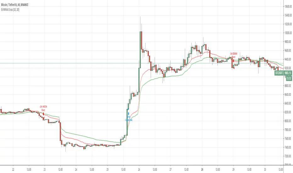 Pretty simple EVWMA (Elastic Volume Weighted Moving Average) Cross Strategy. Long on bullish cross, Short on Bearish Crosss.