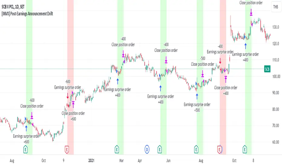 In both scenarios, the position (either long or short) is held for the number of periods specified in the "Holding periods (bar)" input. This strategy is based on the assumption that the stock price will continue to drift in the direction of the earnings surprise for the specified holding period.