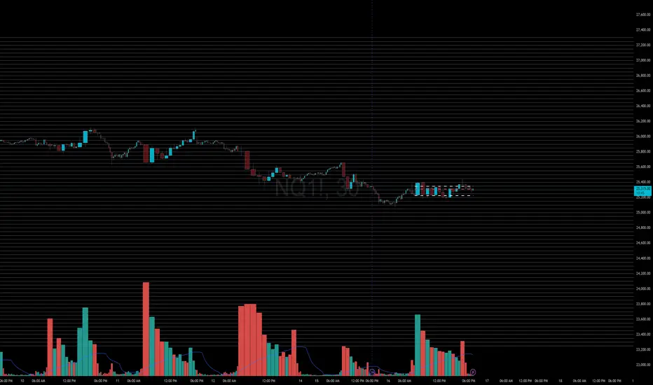 This indicator plots static psychological price levels at fixed point intervals (default every 50 points) across the chart. These levels are commonly watched by traders as natural areas of reaction, balance, support, and resistance, especially on index futures such as NQ, ES, YM, and RTY.