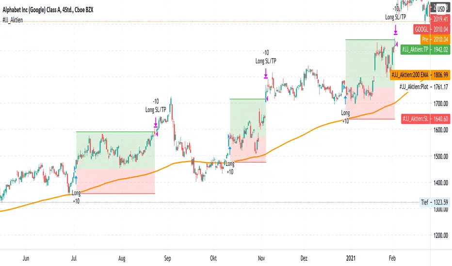 Exact entry points can be identified using the indicator. In addition, a take profit is visualized based on a 3:1 CRV . The stop loss results from a long-term EMA .