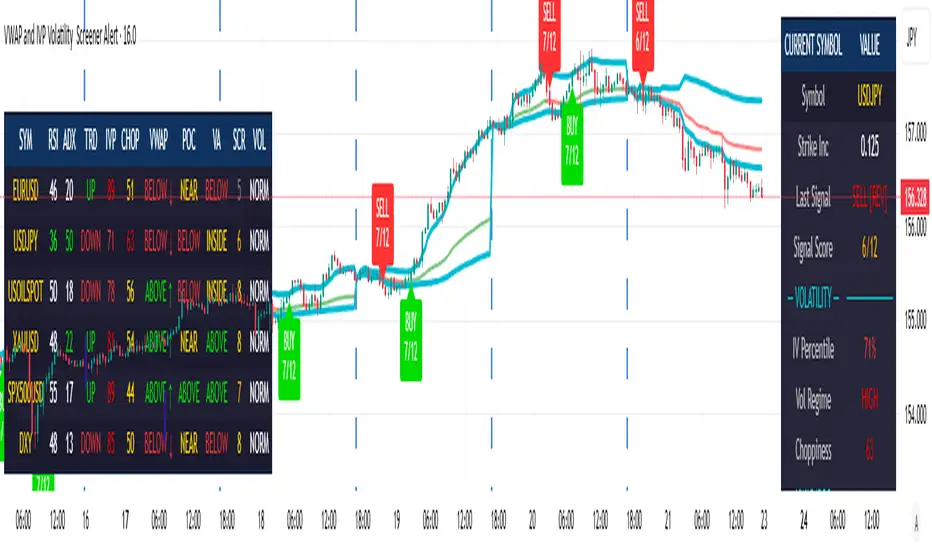 VWAP and IVP Volatility Screener Alert is a multi-asset, institutional-grade market scanner that combines Auto-Anchored VWAP, Implied Volatility Percentile (IVP), Choppiness Index, Strike Price Structure, and Volume Profile (POC / Value Area) to generate high-probability trade signals across multiple symbols.