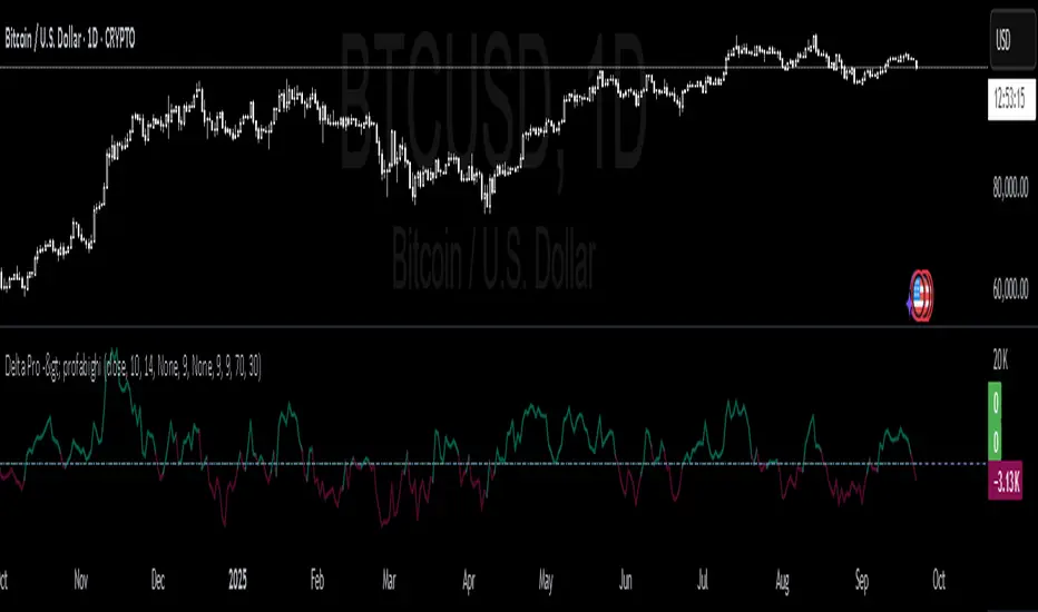This Delta Pro → PROFABIGHI_CAPITAL implements an advanced delta analysis framework combining price delta calculations with RSI-of-momentum analysis, volume-weighted directional pressure measurement, and cumulative volume delta tracking for comprehensive order flow assessment.