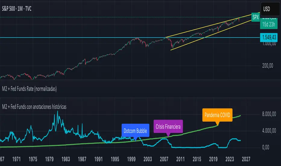 This TradingView indicator creates a separate panel that displays the historical evolution of M2 Money Stock (US) and the Federal Funds Rate, both normalized to a base of 100 for easier comparison. It highlights key historical events with annotations, including: