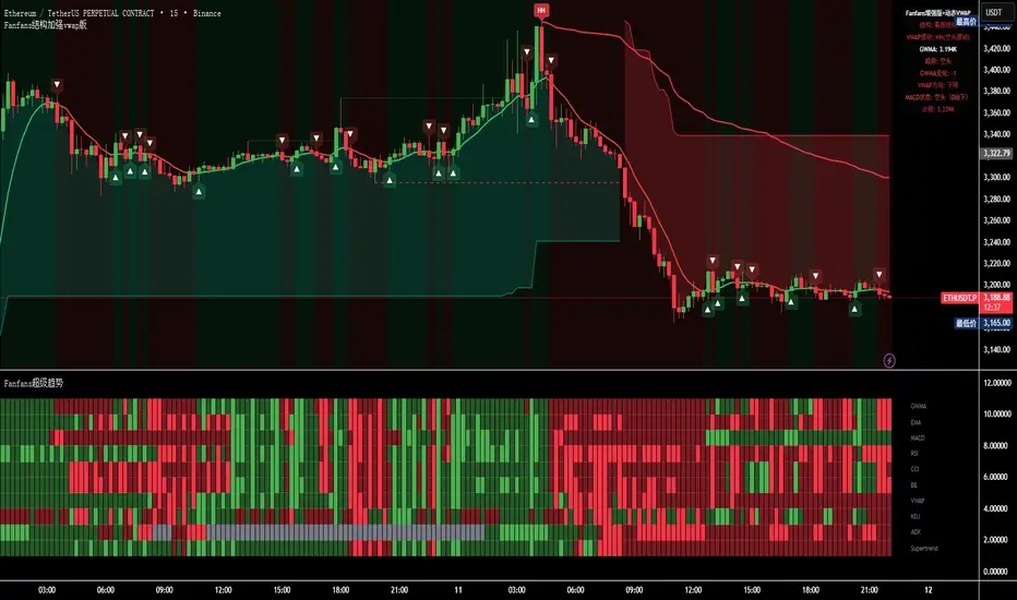 This indicator, named "Multi-Indicator Trend Grid (Weighted Version)", is a comprehensive technical analysis tool. It integrates 10 classic technical indicators, categorized into three tiers based on trading weight: Tier 1 (GWMA, EMA, MACD) are core trend judgment indicators; Tier 2 (RSI, CCI, Bollinger Bands) are trend confirmation indicators; Tier 3 (VWAP, KDJ, ADX, Supertrend) are auxiliary filtering indicators. Using MACD histogram coloring logic, it visually displays the strength changes of bullish/bearish trends through dark/light green and dark/light red colors. This tool helps traders quickly identify market trend directions, confirm signal validity, and filter out false signals. It is particularly suitable for multi-timeframe analysis and trend reversal warnings, providing a visual "trend consensus" judgment method.