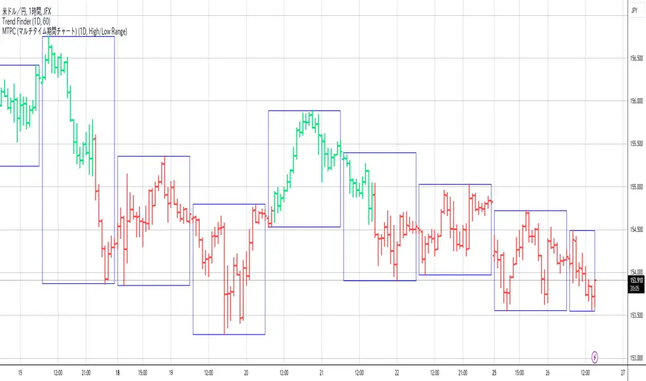 Trend Finderは、指定した時間枠に基づいてブレイクアウトとブレイクダウンを識別するためのインジケーターです。前日の高値と安値を監視し、現在の終値がこれらのレベルを超えたときにバーの色を変更します。