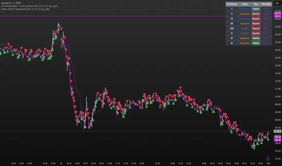 Multi-TF Dashboard: A dynamic, real-time table displaying the Phase, Bias (Bullish/Bearish), and FMV price for eight different timeframes (1m through Monthly).