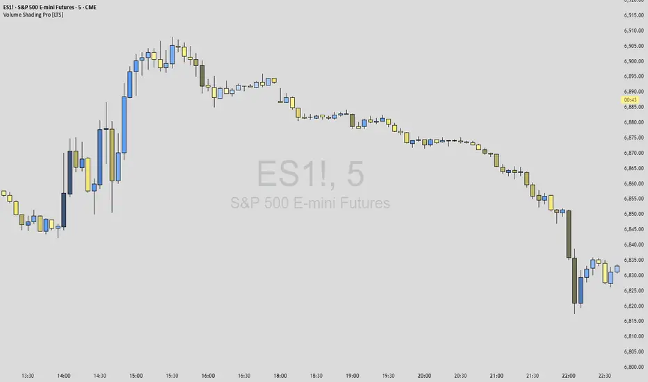 Volume-Based Candle Shading Pro [LTS] is a visual aid that highlights how “unusual” each bar’s volume is compared to recent activity. It adjusts candle colors based on whether volume is above, below, or near its average, helping you quickly spot high-activity pushes and quiet rotations on any symbol or timeframe.