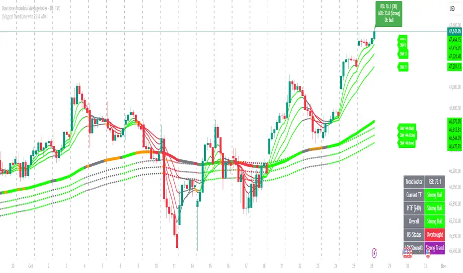 This indicator combines **EMA trend structure**, **RSI**, and **ADX** to form a **multi-layered trend confirmation system** with rich visual cues and a live table dashboard.