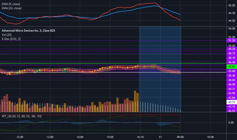This overlay shows the deviation of the exponential moving average of the mid candle price of the currently loaded chart, away from the exponential moving average of the S&P and DOW combined and averaged mid candle price. The top and bottom lines also give a visual perspective of what a certain percentage (default 1%) looks like on the current charts window. This may help with making quick decisions for things like setting trailing stop trades with a percentage. This can be used for stocks, ETF's, and index's and It may be useful in finding potential stocks or ETF's if you are interested in these kinds of deviations. Defaults are set for a dark screen but can be edited to your taste. It's optimized to be an overlay on the current chart window as opposed to being a separate window.