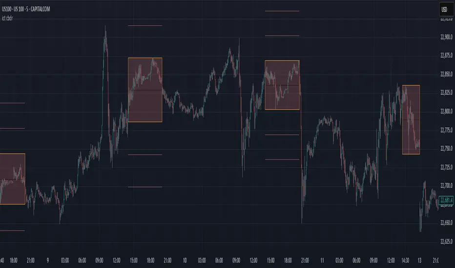 This indicator identifies and displays the Central Bank Dealers Range (CBDR), a concept from Inner Circle Trader (ICT) methodology. The CBDR represents the consolidation period between 2:00 PM and 8:00 PM New York time, during which major financial institutions establish their positions.