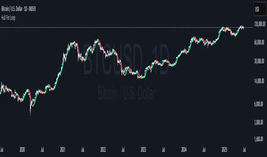 Hull For Loop is a sophisticated trend-following indicator that combines the smoothness of Hull Moving Averages with advanced trend detection algorithms and robust confirmation mechanisms.