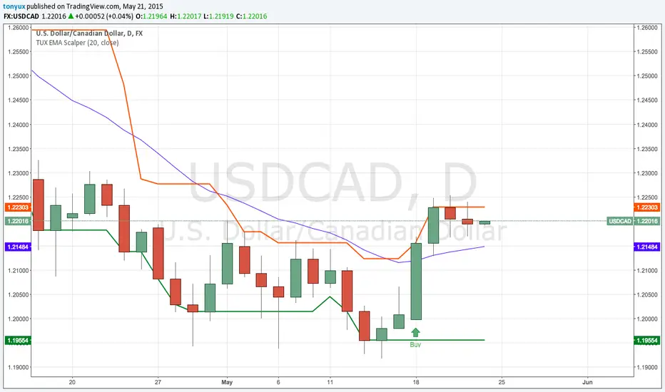 It works by checking if the price is currently in an uptrend and if it crosses the 20 EMA.