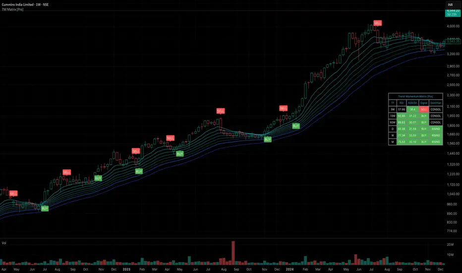 The Solution: Trend-Momentum Matrix The Trend-Momentum Matrix [Pro] is a professional-grade dashboard that condenses complex market data into a single, high-contrast heatmap. It allows you to monitor the health of a trend across 7 distinct timeframes simultaneously—from scalping charts to long-term views—without cluttering your screen.
