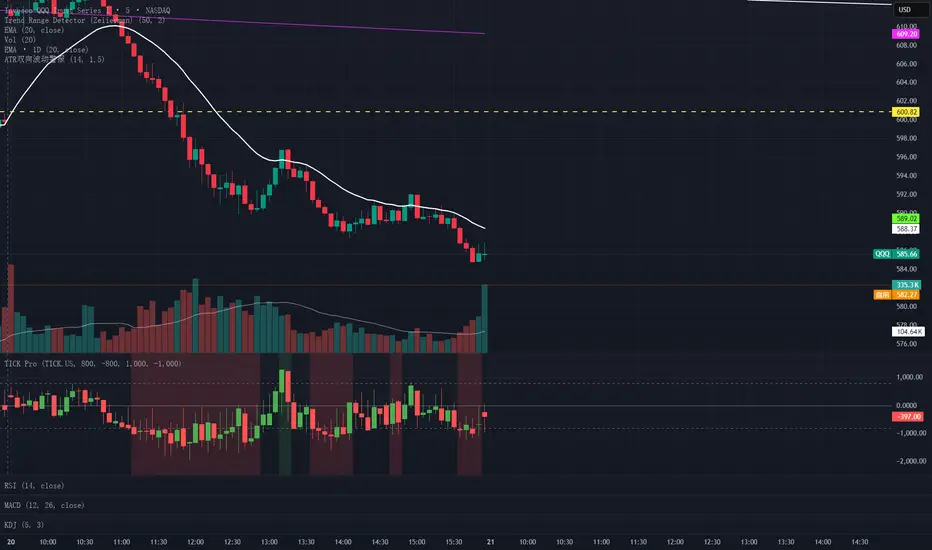 This indicator is designed to provide intraday traders (especially those trading SPX, ES, and NQ) with a clearer NYSE TICK analysis tool featuring visual alerts. Unlike traditional TICK line charts, this indicator utilizes OHLC Candlesticks to display data, allowing you to fully view the Open, High, Low, and Close within a specific timeframe, thereby capturing instantaneous liquidity sweeps.