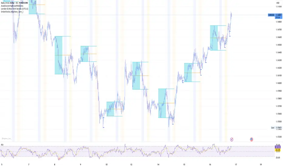 This script highlights the London and New York trading sessions on the chart, adjusted for UTC+2 timezone. It's designed to help traders easily visualize the most active and liquid periods of the Forex and global markets directly on their TradingView charts. The London session typically provides strong volatility, while the New York session brings increased momentum and overlaps with London for powerful trading opportunities. Ideal for intraday and session-based strategies.