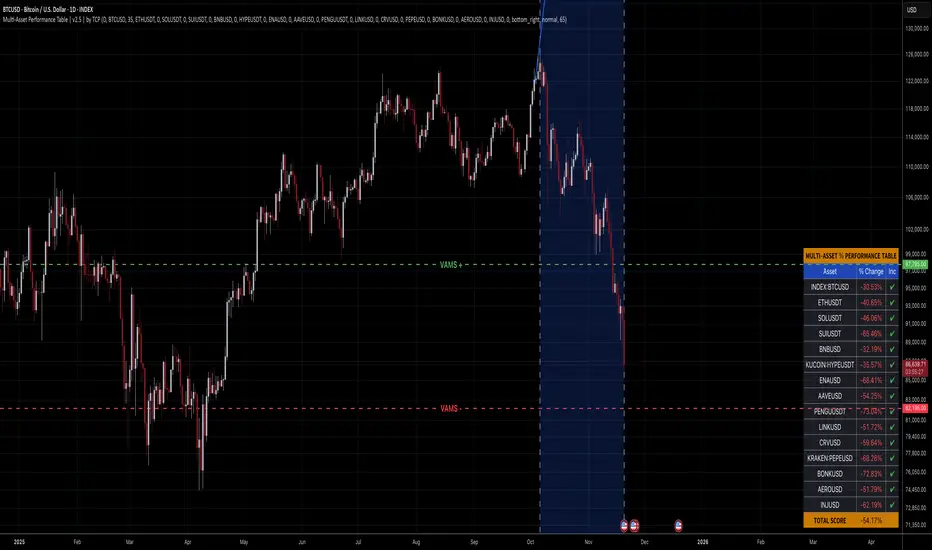 Multi-Asset % Performance Table eliminates the need to manually draw and manage individual "Price Range" tools for every asset. It automatically tracks up to 15 tickers independently in a single dashboard, calculating a TOTAL SCORE (Portfolio Average) for you. Unlike manual drawings, it supports a Global Range while allowing Custom Dates for specific assets, ensuring each ticker is calculated based on its own precise entry/exit. The Smart Visuals dynamically draw the correct date lines only for the ticker you are currently viewing, keeping your chart automatic, accurate, and clutter-free.