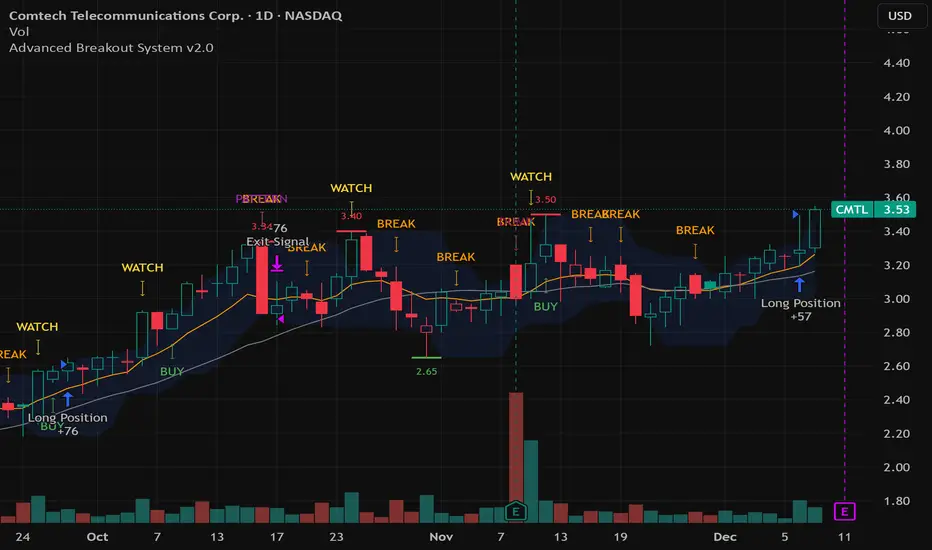 - Entry settings: Consolidation Lookback (default 20) = bars used to detect consolidation. Consolidation Range % (default 12%) = max allowed range size. Volume Spike Multiplier (default 1.2) = factor above average volume to count as a spike. Force Signal on Big Moves (default ON) = forces a WATCH signal on high-momentum moves.