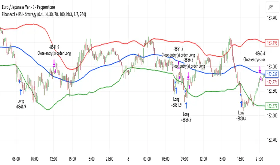 It combines volatility-based Fibonacci bands with RSI momentum signals to identify temporary price extremes and trade pullbacks back toward fair value.