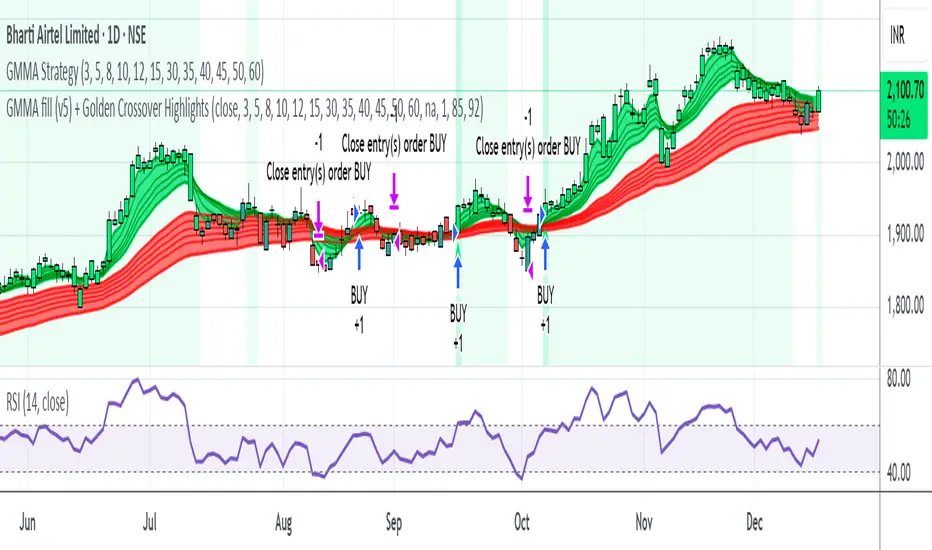 This setup combines the Guppy Multiple Moving Average (GMMA) Fill version 5 with Golden Crossover signals to identify strong trend continuation and potential breakout points. GMMA provides layered moving averages for short- and long-term trend analysis, while the Golden Crossover highlights bullish momentum shifts, making it ideal for spotting entry opportunities in trending markets.