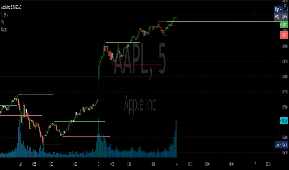 The lookback period will delay the formation of new pivots. In the original two indicators, the pivot lines would stop drawing. I have added a line extension from the most recent pivots forward to indicate whether the current market price exceeds or is within the recent pivot point ranges. If the market price is above or below the high or low pivots respectively, the line will become solid. Otherwise, the pivot extension lines will be dotted.