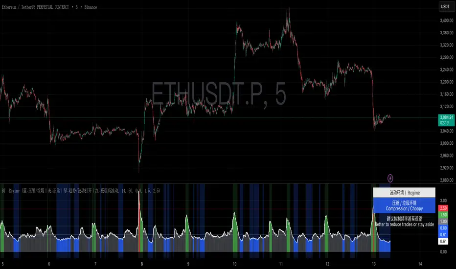 BullTrading Regime Filter 是一款基于 ATR 波动比值的市场环境识别工具,用颜色一眼区分「压缩垃圾 / 正常 / 趋势打开 / 极端高波动」。它帮助你在该打的时候出手、在不该打的时候克制:压缩少做,趋势重点做,极端降杠杆控风险。支持背景着色、当前环境标签与固定颜色图例,适配 3m/5m/15m 日内节奏。