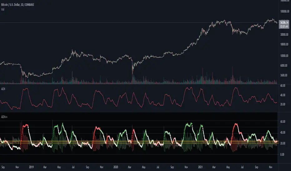 For quicker and easier interpretation, the ADX line is displayed in a heatmap style. The more absolute difference between both DIs, more intense the color.