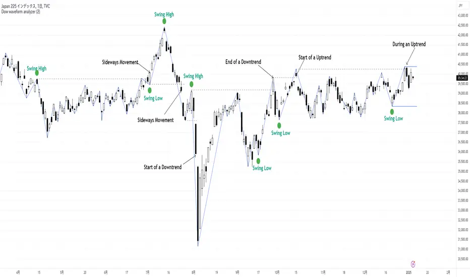 This indicator is a tool designed to analyze chart waveforms based on Dow Theory, identifying swing lows (support) and swing highs (resistance). It allows users to quickly and consistently determine trend direction. Compared to manual analysis, it provides more efficient and accurate results.