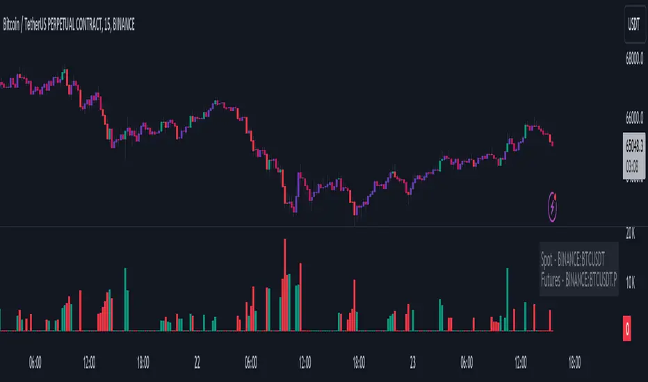 The Volume Liquidations Indicator is designed for traders who want to spot significant liquidation events in the cryptocurrency markets, particularly between spot and futures volumes. This powerful tool auto-detects the trading asset and compares the volume data from both spot and futures markets to highlight potential high-volume liquidation points that can significantly impact price movement. Raw source code owner - tartigradia