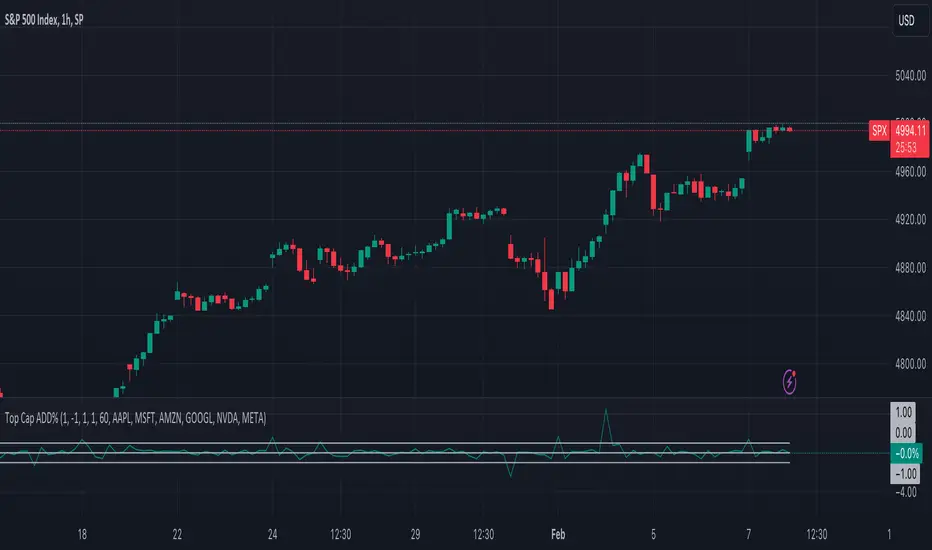 This is a very basic oscillator that plots the average % change of the top 6 highest market cap stocks in the S&P500. It can be easily modified to suit your needs on which stocks you'd like to track, and or filter out the threshold you're looking for.The v2 update includes the following changes: