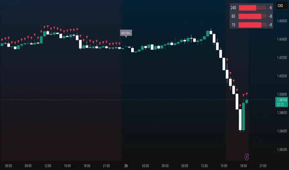 A comprehensive trend analysis indicator that systematically combines six technical indicators across three customizable timeframes, using a weighted scoring system to identify high-probability trend conditions.