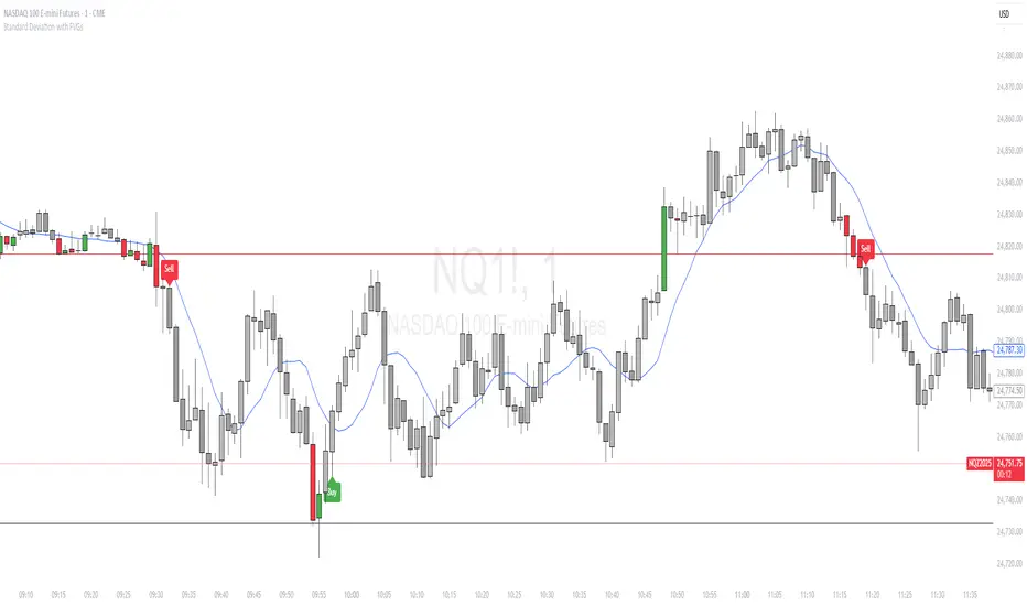 Once price touches a Standard Deviation key level, the indicator paints the candle red or green and plots the most recent m1 Fair Value Gap. If there is an inversion (iFVG), a Buy or Sell signal prints.
