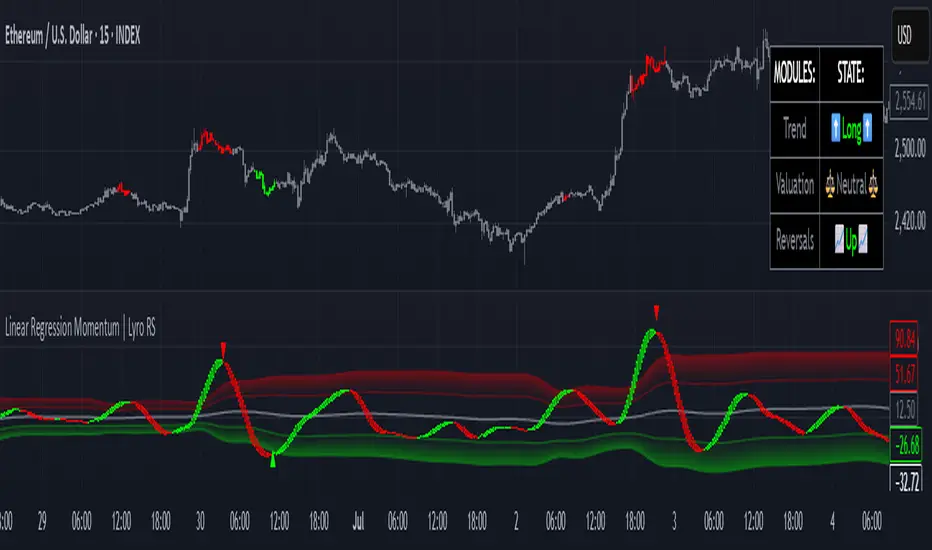 At its core, the script calculates momentum from a chosen source and then applies linear regression to extract slope-based information. This slope is smoothed through user-selected moving averages and used as the central momentum curve. Around this core, standard deviation bands are constructed, enabling detection of overbought and oversold zones relative to the momentum slope. The indicator offers three operational modes: Trend, which classifies directional bias based on slope relative to a dynamic midline; Valuation, which evaluates whether momentum is extended toward extremes; and Reversals, which identifies potential turning points when slope and price action diverge. Each mode is supported by visual cues, colored candles, standard deviation envelopes, and a configurable table summarizing active states.