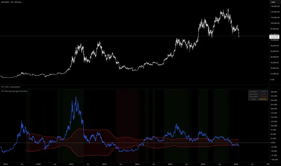 This indicator measures how far price has deviated from its moving average as a percentage, with dynamic standard deviation bands to highlight extreme conditions.