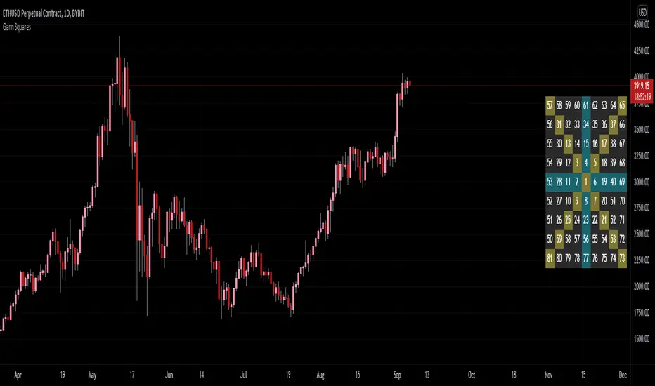 THIS IS NOT TRADING ADVICE; please use your own technical analysis before making any decisions based off of public indicators. Learn more about Gann's Squares before attempting to use them as this script was not meant to give you answers, only the table.