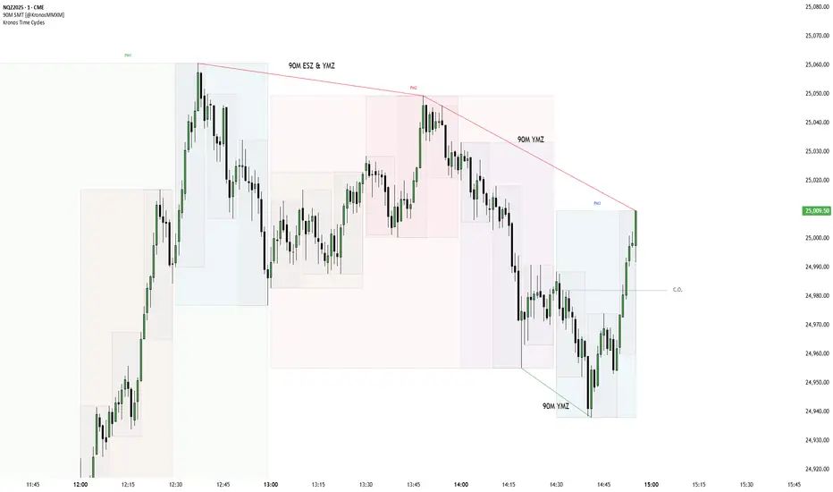 This indicator identifies Smart Money Time (SMT) divergences between correlated assets, specifically optimized for the 90-minute intraday cycle. It automates the process of comparing price action between a primary asset (e.g., NQ) and a correlated asset (e.g., ES) to highlight moments where price symmetry breaks—often a precursor to a reversal or a liquidity run.