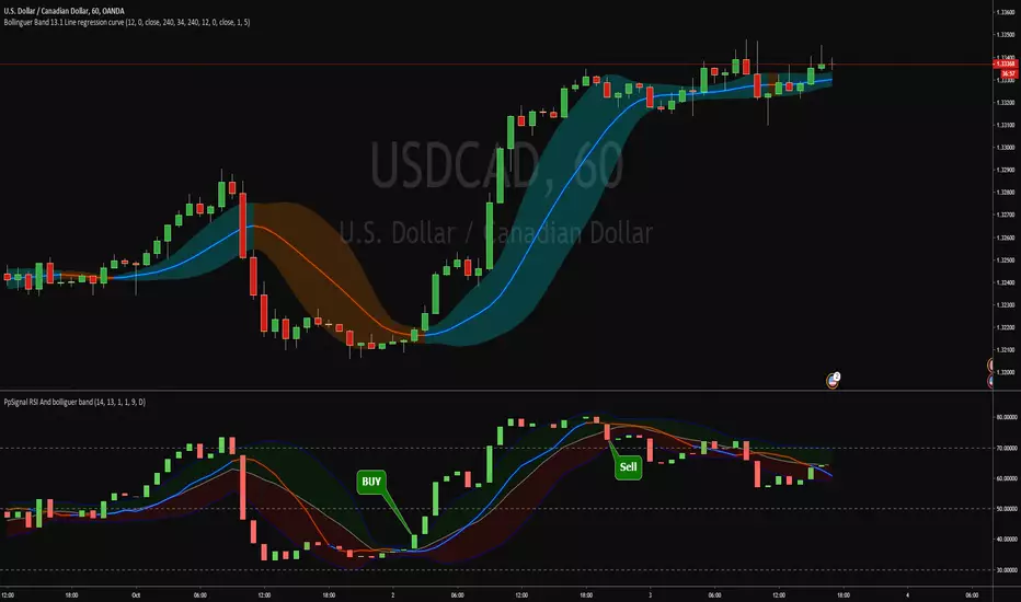 RSI bollinguer band oscillator, buy when the Ma is blue and the rsi is on the upper band and sell when de ma is red and rsi is cross down the lower band..