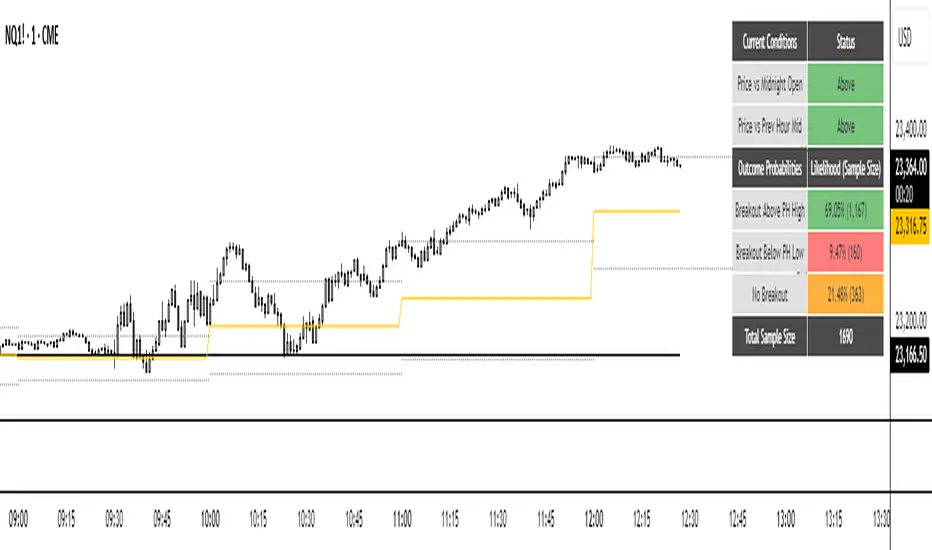 This indicator provides a statistical analysis of the Nasdaq 100 (NQ) on an hourly timeframe. It displays the historical probability of the current hour's candle breaking above the previous hour's high (PHH) or below the previous hour's low (PHL). The probabilities are contextual, changing based on the current hour of the day and the price's position relative to key levels.