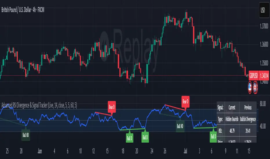 Each signal is marked directly on the RSI chart with labeled lines for clarity. - RSI Signal Tracker Panel
