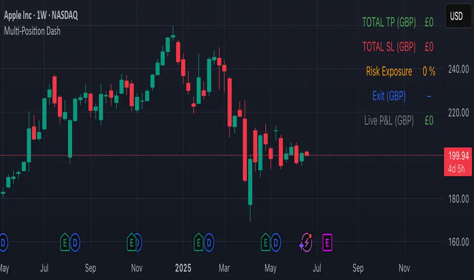 The Multi-Position Dash is a highly customizable trading dashboard designed to help active traders manage up to 8 simultaneous positions across Forex, Stocks, and Indices. Whether you're trading single entries, layering positions, using DCA (Dollar Cost Averaging), or running complex hedging setups, this tool provides essential, real-time risk and P&L insights—directly on your chart.