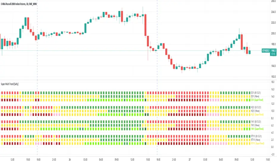 This script uses the 5, 8, 13, 21, 34 low, 34 close, 34 high, and 55 EMAs in comparison to each other to gauge momentum and trend strength for the current ticker. Additionally, it provides the ability to compare to 3 additional tickers at the same time (Uncheck boxes in settings to hide if desired). For the Super Trend Row darker colors are more bearish than lighter colors, and consequently lighter colors are more bullish than darker colors. Yellow indicates a neutral or choppy market. Fully stacked EMAs are shown with a Light Green (Lime) color for the bullish condition, and Dark Red for the bearish condition.