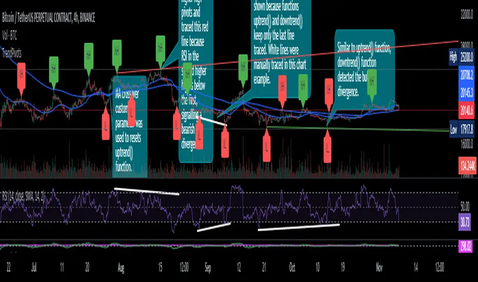 - Traces lines every lower low pivot (green = bullish divergence in downtrendPivot()).