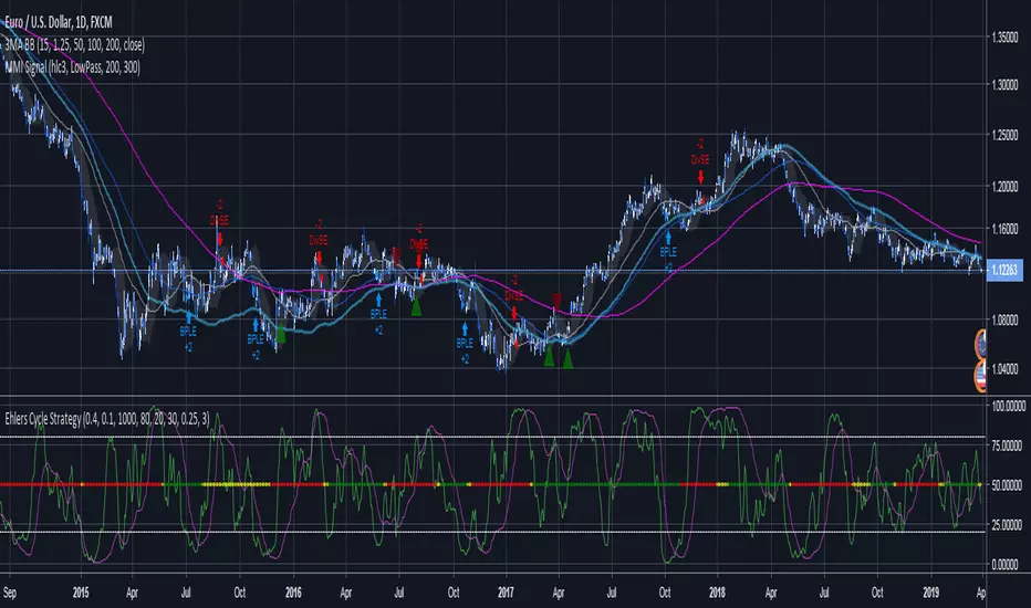 Shout out to HPotter, Everget, and LazyBear for implementing many of Ehlers indicators, which I sampled to create this indicator and strategy.
